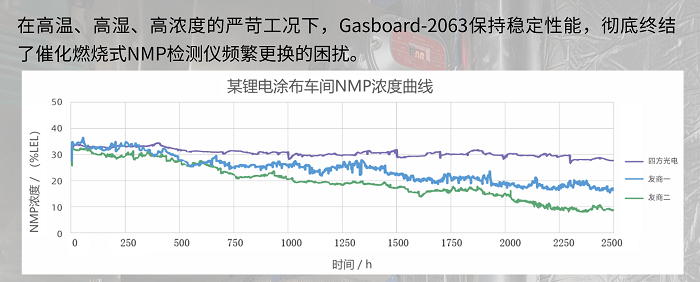 国内某锂电池涂布车间,陆续在三个月的实测数据显示,巅峰国际NMP检测器运行稳定,实现免维护、无衰减、无中毒;而另外两家友商的催化燃烧式检测器,已出现明显衰减,测试数据偏差达到50%以上。
